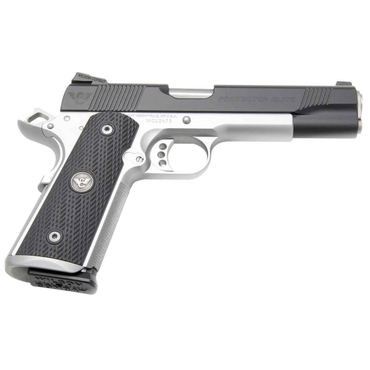 Wilson Combat 1911 Protector Elite 45 Auto (ACP) 5in Black Pistol – 8+1 Rounds – Wilson Combat Custom Pistols are hand machined from forgings and billet steel. The Protector Elite is a full size fighting pistol with Wilson’s most popular options and is ideal for the tactical shooter looking for an upgraded custom pistol. It had slide top serrations, black grip with pewter medallions, speedchute, rear slide serrations, Battlesight with tritium front sight and rough texture starburst grips. The two-tone finish and one-piece Bullet Proof magwell set this pistol apart from the rest of the pack.